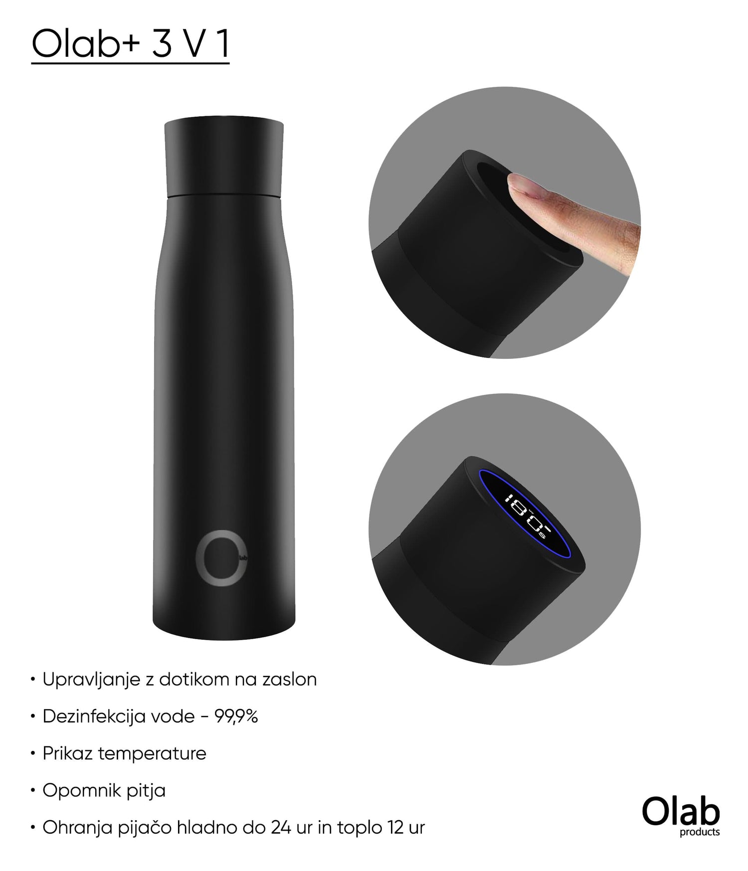 Pametna steklenica Olab+ 3 v 1 uporablja inovativno UV-C LED tehnologijo, ki dezinficira vodo z 99,99% učinkovitostjo. Ponaša se tudi s prikazom temperature vode in opomnikom pitja.